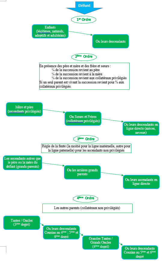Lorsque le défunt n'a pas fait de testament, c'est la loi (la dévolution légale) qui désigne ses héritiers et les classe par ordre de priorité pour effectuer la transmission de son patrimoine.
