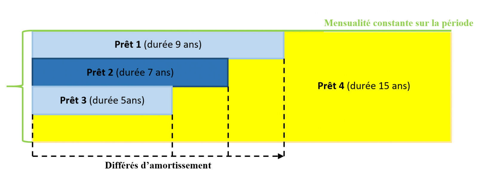 L’idée est de profiter d’un taux plus bas sur le crédit de plus court terme et ainsi d’abaisser le taux d’intérêt moyen de l’enveloppe totale en lissant les remboursements pour obtenir une échéance constante.